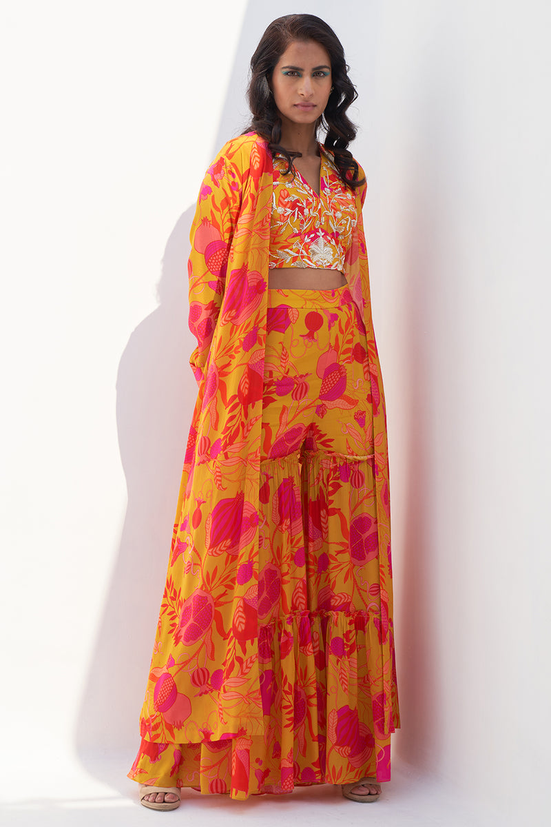 The yellow hilong set is digitally printed on natural crepe silk paired with a curated hand embroidered zari blouse paired with flared pants and a matching shrug