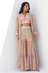 The green hilong set is digitally printed on natural crepe silk paired with curated hand embroidered zari blouse paired with flared pants and a matching shrug