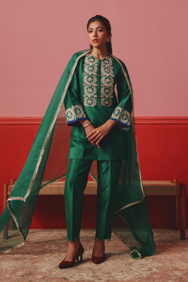 A rich plum kurta set crafted in pure silk, adorned with intricately hand-embroidered bird motifs in shimmering resham and zari. Paired with tailored straight pants and a silk organza dupatta featuring glistening hand-finished borders, the ensemble strikes a graceful balance between elegance and bold artistry.