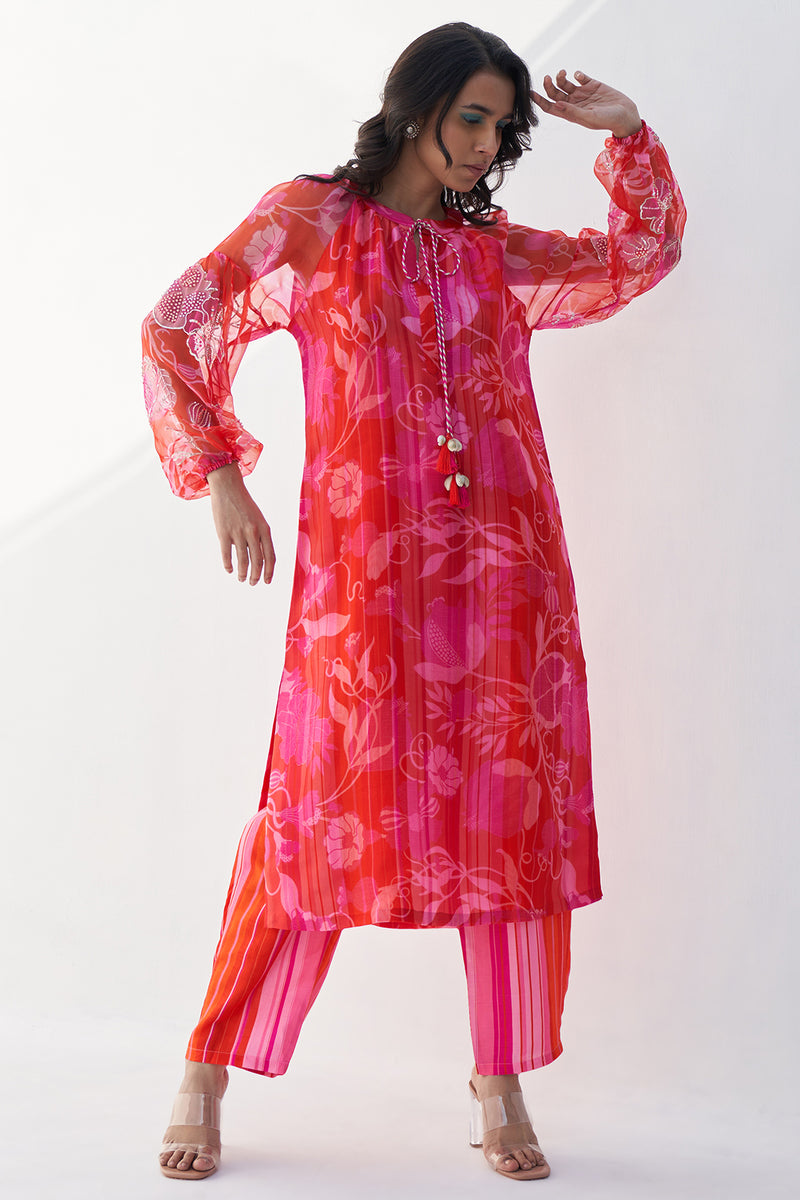 The red pavilion zar dress is made up double layered organza fabric with digital prints with a tie up in the front and intricate hand embroidered sleeves paired with pants