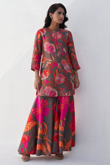 The grey symphony is made up of natural bemberg silk with pomo highlighted digital prints along with delicate hand embroidery paired with flared sharara pants and matching duppata